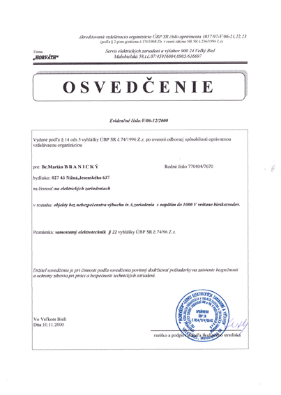 - Osvedčenie §22 – November 2000