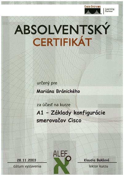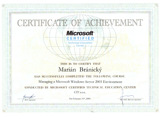 - Microsoft Windows server 2003 – Správa a údržba – certifikovaný MCP – Apríl 2005